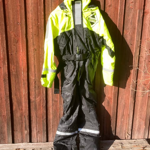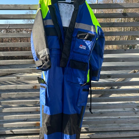 Röd flytoverall med grå detaljer. Heltäckande modell med långa ärmar och ben samt hög krage. Dragkedja framtill och justerbart bälte i midjan.