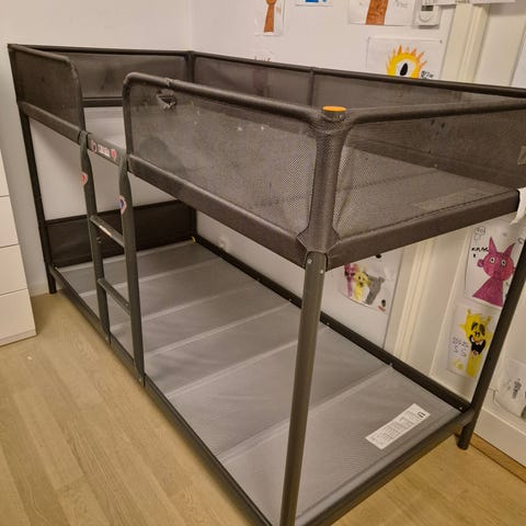 IKEA loftsäng i grå metall. Sängen har stege framtill och höga sidor med nätpanel runt liggytan. Konstruktionen är i stål med pulverlackerad yta.