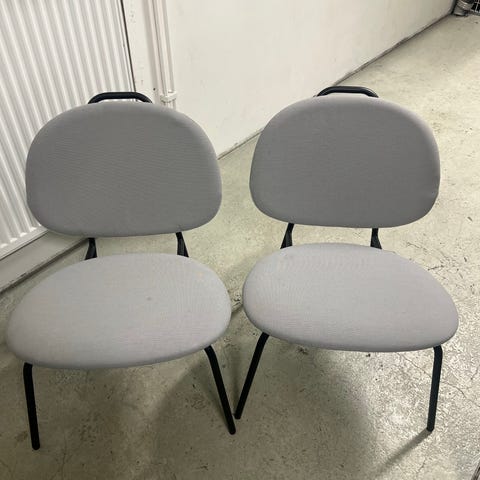 Stilrena stolar med ljusgrå/ grönaktig tygklädsel och svart
