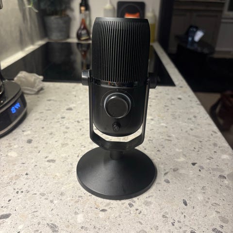 Blue Yeti X USB-mikrofon i svart färg. Mikrofonen står på ett justerbart bordsstativ och har reglage på framsidan för nivå- och inställningskontroll. Passar för användning vid dator, till exempel för inspelning av röst, streaming, videomöten eller podcast. Levereras med avtagbart puffskydd och kabel