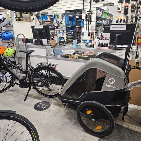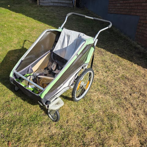 Merida cykelvagn för ett barn. Invändigt finns sittplats med sele för barn samt fotutrymme och 2 fickor för förvaring av småsaker.