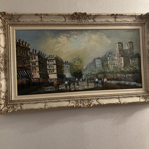 Osignerad oljemålning med stadsmotiv som föreställer antika ruiner, byggnader och människor i en historisk miljö. Målningen är rektangulär och monterad i en dekorativ, profilerad guldfärgad ram med ornamenterade hörn och kanter. Färgskalan domineras av jordnära toner med blå himmel och moln. Passar som väggdekoration i exempelvis vardagsrum, hall eller kontor. Höjd 110, bredd 80, ram djup 8, ram bredd 10,5. Kontrolleras av köpare. Olja? Olja+ tryck?
