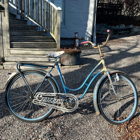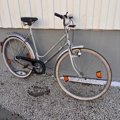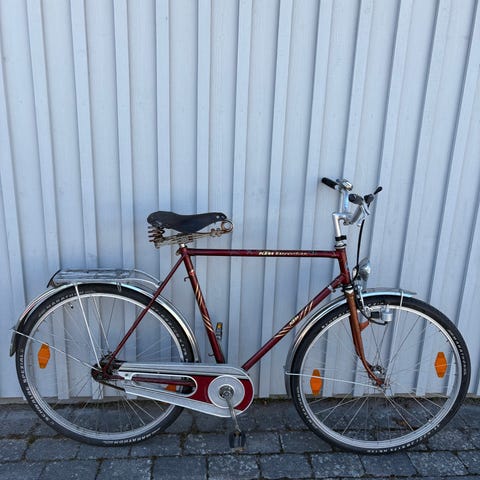 Superfin retromodell med skön geometri och klassiskt bärhandtag på ramen. Oväxlad med vanlig fotbroms. Fint patinerad ram med välhållna detaljer i rostfritt och krom. Grundligt nyservad med utbytta nya däck, fungerar utmärkt.
