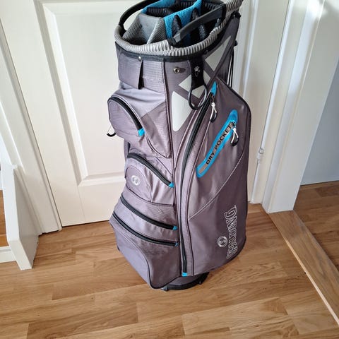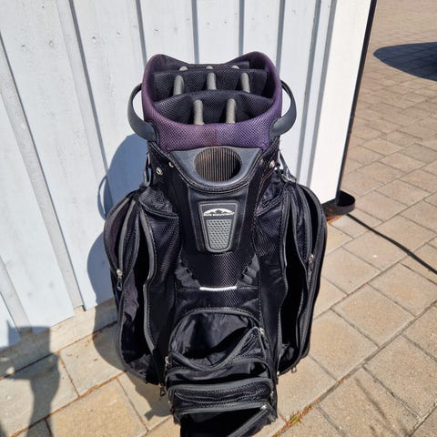Golfbag vagnbag i gröna och vita nyanser med blå detaljer. Väskan har flera ytterfickor med dragkedja för förvaring av tillbehör. Topp med 15 klubbindelare som håller klubborna åtskilda. Bärhandtag och remmar för enkel hantering. Passar för användning på golfvagn eller vagnliknande transport på golfbanan.
