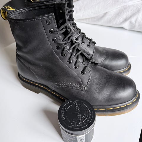 Dr. Martens 101 Crazy Horse i storlek 43. Modellen är ankelhöga snörstövlar i brunt läder med den klassiska Dr. Martens-sulan. Ovandel i slätt läder, snörning framtill och dragflik bak.