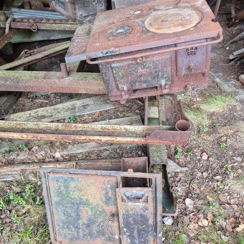 Två kokplattor med lösa ringar och original luckor finns kvar. Spisen är i bra grundskick men har ytrost efter ålder – perfekt för den som vill renovera eller använda som dekor.