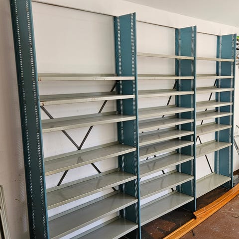 Hyllsystem i metall med trähyllplan i vit stomme. Flera sektioner med flera hyllplan i varje, lämpliga för förvaring i förråd, garage eller lager.