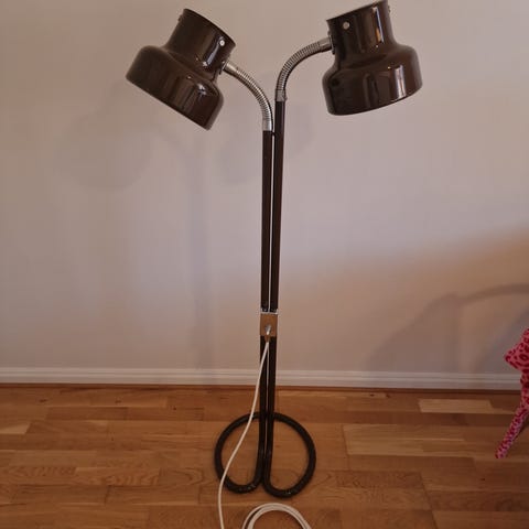 Snygg golvlampa från 1950-talet. Lampan behöver nya knappar (strömbrytare) för att fungera som den ska. I nuläget lyser en av lamporna när man sätter i kontakten, priset är satt med det i åtanke.