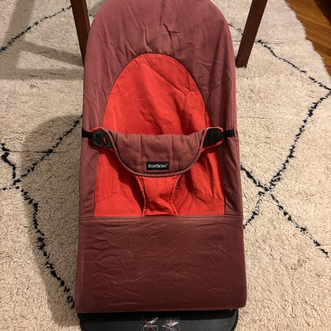 Babybjörn babysitter i röd textil med svart ställning. Modellen är en klassisk babysitter med justerbart lutningsläge och avtagbar sittdel i tyg. Tyget är solblekt/urtvättat inget som stör funktionen.