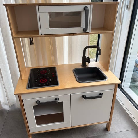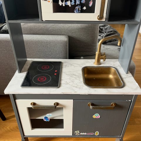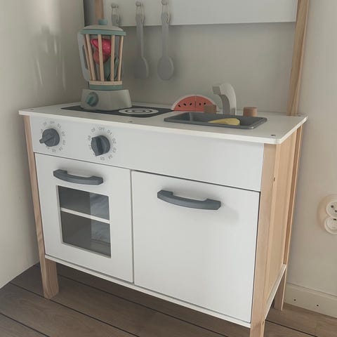 Leksakskök i trä i blå och vit färg. Köket har spishäll med vred, ugn med lucka, diskho i metall samt kran. Det finns öppna hyllor på sidorna för förvaring av leksakskärl och tillbehör. Ovanför arbetsytan finns en liten hylla och krokar för upphängning. Passar för barn som vill leka kök och matlagning inomhus.
