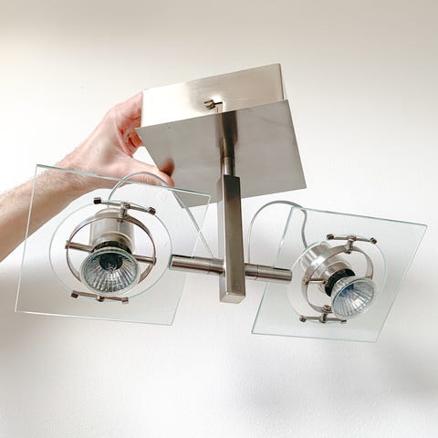 Tre stycken likadana vintage IKEA taklampor med fyra riktbara spotlights. Klassiskern "FUGA" med vridbara spotlights i alla riktningar monterade på glasplattor med en stomme i borstat stål. Ljuskällor är utbytbara med vanliga GU10-lampor och är kompatibel med både LED- och halogenljuskällor max 35W. Mått ca 37 x 37 cm. Lampan hänger ned ca 20 cm från taket.