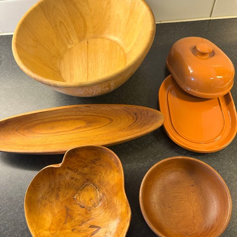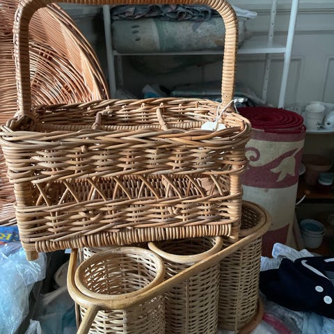 Blompidestal,brickbord och vedkorg i naturfärgat trä och rotting. . Den runda korgen har handtag och kan användas för förvaring eller som picknickkorg. Den rektangulära korgen har hög kant och handtag, lämplig för tidningar, ved eller annan förvaring. Båda korgarna visar tecken på slitage och har skador på handtagen som kan behöva lagas. Det är handtag på 2 st som behöver lagas. Annars i fint/helt skick. Blompidestal behöver stärkas, lite vickig. Avlutad är den. Material till handtag medföljer. Skickas ej, hämtas på plats. Mvh Eva 500kr för alla 3
