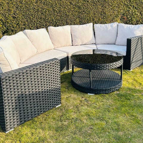Hörnsoffa i grå konstrottning. Tillhörande bord med avtagbart lock. Finns även förvaring under sitsen i soffan. Tillhörande kuddar i beige vattenavisande material. Modellen heter Sollerön och har utgått från IKEAS sortiment.