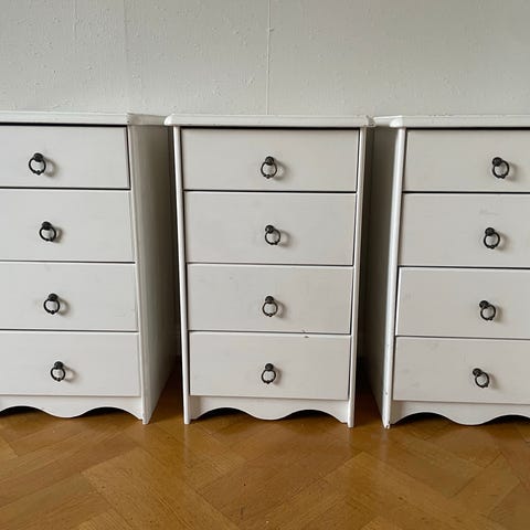 Sängbord med låda vita i trä.