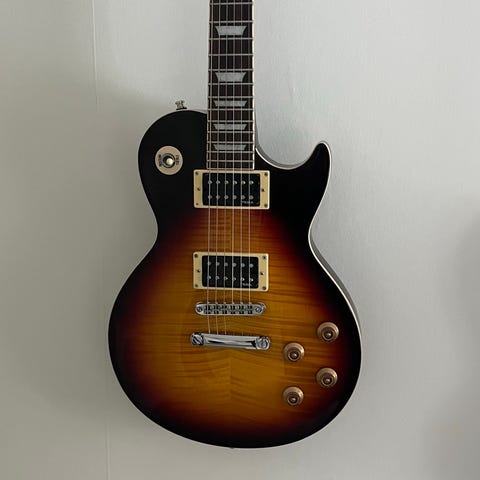 Maybach elgitarr i single cut‑modell med två humbucker-mickar. Kropp i trä med brun sunburst-finish på framsidan och rödbrun baksida. Lönnhals med greppbräda i mörkt trä och trapetsinlägg. Gitarren har treläges pickupväljare, två volym- och två tonkontroller samt fasta stämskruvar i metall med ljusa plastknoppar. Passar för elgitarrspel i olika musikstilar.