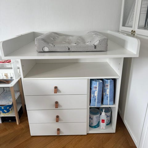 IKEA skötbord i vit färg. Översta delen har en uppfällbar skötyta. Under skötytan finns en öppen hylla för förvaring av till exempel blöjor och hygienartiklar. Nederst finns lådor som ger extra förvaringsutrymme för barnkläder eller tillbehör. Möbeln är avsedd för barnomsorg i hemmet och kan placeras mellan sängar eller mot vägg i barnrum eller sovrum.