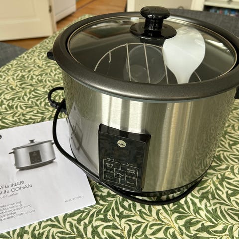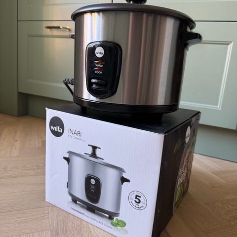 Wilfa riskokare i rostfritt stål med glaslock. Innerkärl med non-stick-beläggning och löstagbart galler för ångkokning. Utrustad med kontrollpanel på framsidan och elsladd med stickkontakt för användning i vanligt vägguttag. Passar för tillagning av ris och ångkokning av olika livsmedel i hemmet.