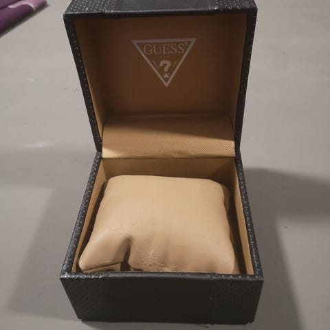 smyckesförvaring i form av en klocklåda. Lådan har svart utsida med ljus söm och fack med kuddar på insidan för förvaring av flera klockor eller armband. Ovansidan har ett fönster som gör innehållet synligt och lådan stängs med spänne framtill. Passar för organiserad förvaring av klockor och smycken i hemmet eller vid resa.