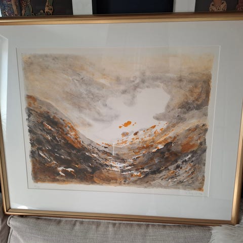 Konstgrafik i form av en signerad och numrerad tavla med motiv från fjällvärlden. Verket är i mycket gott skick, Tavlan är numrerad 288/390 och daterad -87. Den är inramad med passepartout och glas i en ljus ram. Mått: B 73.5 cm x H 88.0 cm