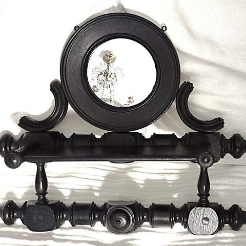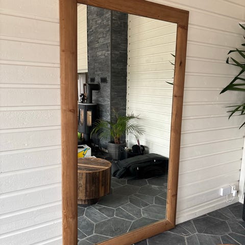 En hel spegelvägg från 80-talet, bestående av 6 separata speglar med tillhörande glashyllor och fästen, är ett klassiskt exempel på 80/90-talets inredningsstil där speglar användes för att förstora badrum och hallar.
