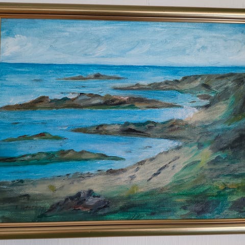 Mindre tavla/oljemålning med motiv av ett hav och klippor/kobbar.