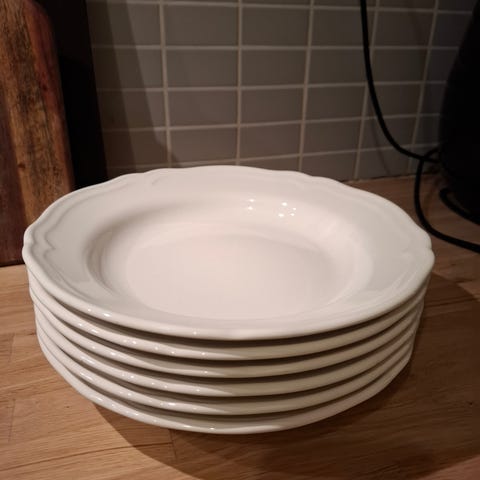 IKEA tallrikar Arv i vitt porslin. 6 st djupa och 6 st flata tallrikar. Klassisk rund form med lätt vågig kant. Passar som mattallrikar i kök och matsal. Lämpliga för dagligt bruk och dukning vid måltider. Kan kombineras med annat vitt porslin från IKEA eller liknande serviser.