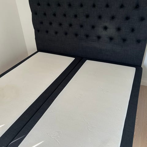 Två sängar med sänggavel i vit färg. Sänggaveln är stoppad och har knapptuftad framsida. Madrass ingår enligt bild. Passar som komplett sänglösning i sovrum. Mått: 105 cm x 200cm.