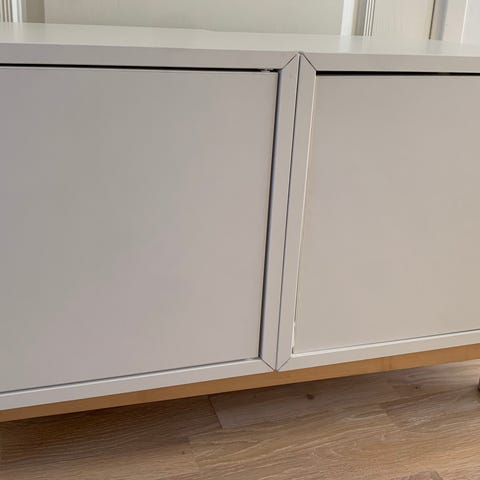 Vägghängt vitt skåp med trädörrar. Väl omhändertaget. Har en liten fläck på ovansidan (se bild). Dörrar utan handtag, öppnas genom ett tryck.