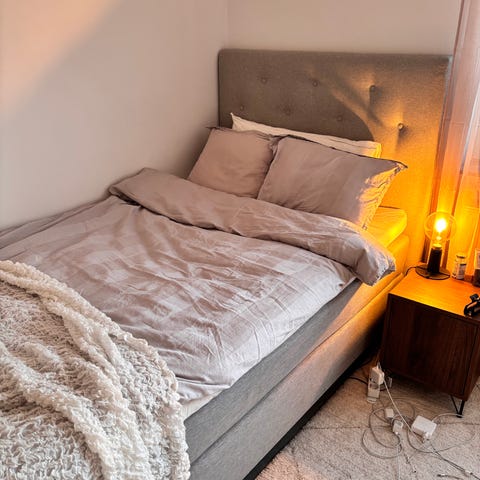 Sängen är välanvänd men stabil och fungerar bra. Bäddmadrassen har några fläckar, men överdraget är avtagbart och tvättbart. Även resårbotten har mindre fläckar (se bild).