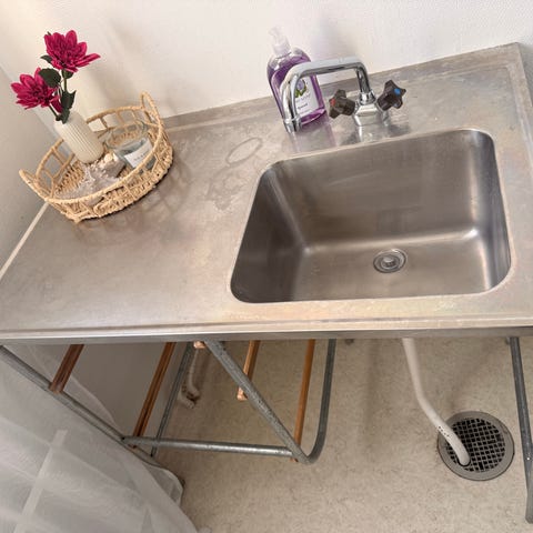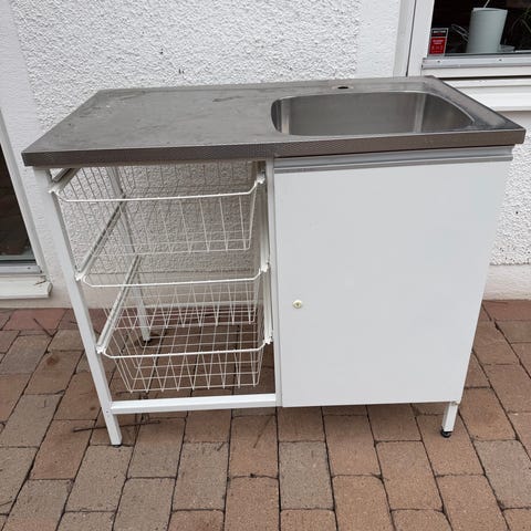 Diskbänk i rostfritt stål med integrerad diskho. Bänken har slät arbetsyta samt uppvikt bakkant mot vägg. På ena sidan finns öppna metallhyllor för förvaring och på andra sidan ett underskåp med vit lucka och hyllplan.