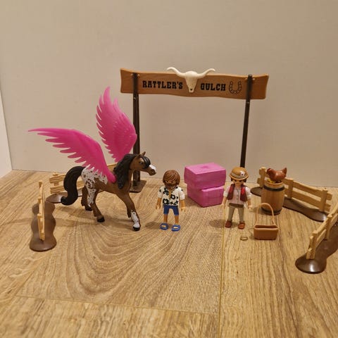 Schleich hästfigurer set. Innehåller flera hästar, bland annat en häst med vingar, ett föl, en ryttare samt tillbehör som hästtäcke och små foderdelar. Figurerna är detaljerade plastleksaker anpassade för barn och samlare av häst- och stallmiljöer.