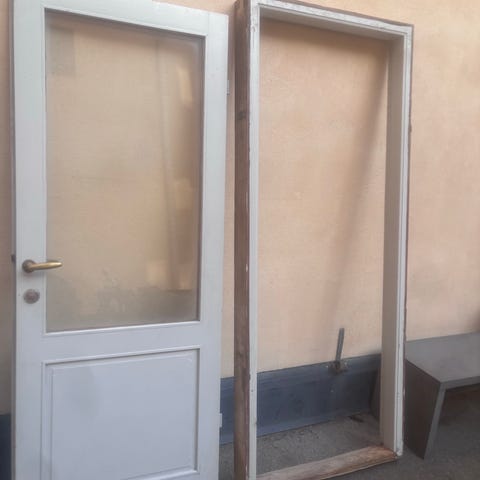 Glasade innerdörrar i trä med brun kulör. Dörrarna har flera glasrutor per dörrblad och är utrustade med gångjärn och runda dörrhandtag. Passar som innerdörrar i bostad eller kontor där man vill släppa igenom ljus mellan rummen. Mått karm 95x212. övere halvmåne 40 hög. Går att såga bort om man vill ha bara dörrarna.