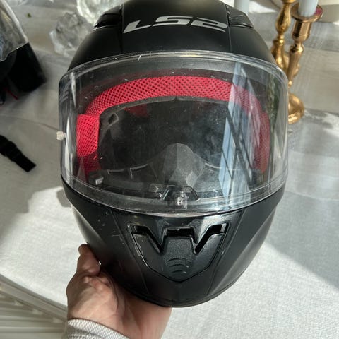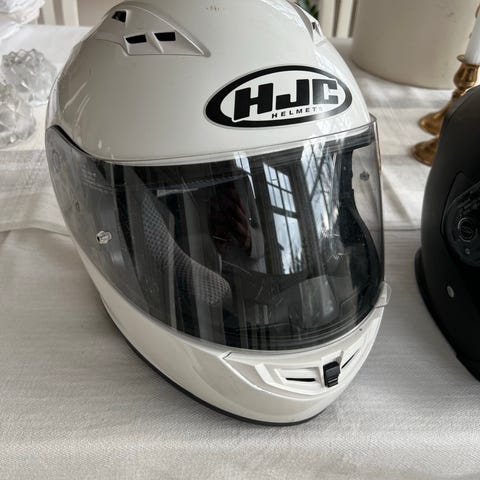 Hjälmen är begagnad och har en del ytliga repor på skalet och visiret (se bilder), men inget som påverkar funktionen. Den har aldrig varit med om någon olycka eller tappats i marken.