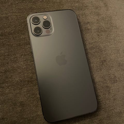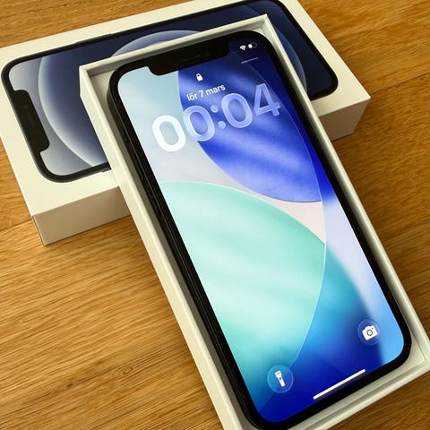 Apple iPhone 12 mobiltelefon med 128 GB lagringsutrymme. Modellen har en svart framsida och baksida samt dubbla kameror på baksidan.