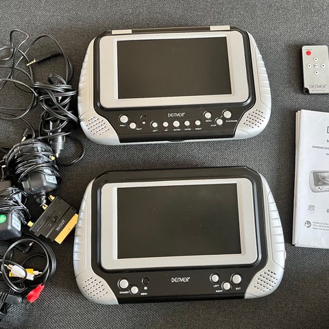 Bärbara DVD-spelare med skärmar i svart utförande. Setet består av flera enheter med inbyggda skärmar och högtalare, lämpliga för uppspelning av DVD-filmer. Passar till exempel för användning i hemmet eller på resor där en kompakt videolösning önskas. Hörlurar och kablar kan anslutas för ljud och ström, beroende på medföljande tillbehör.