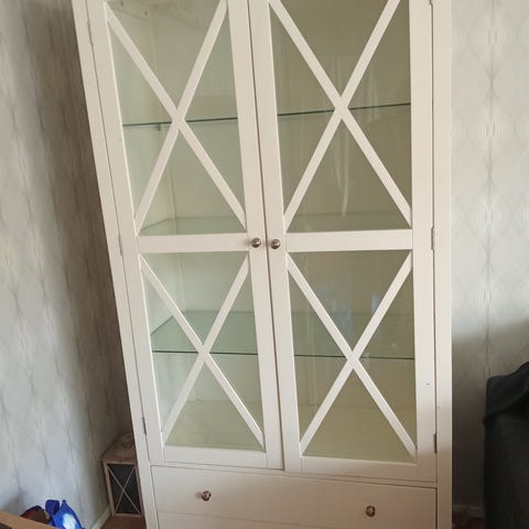 Vitt vitrinskåp med glashyllor, från IKEA i mycket fint skick.