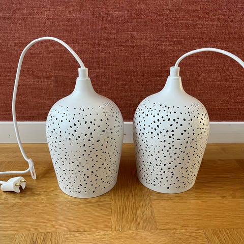 Två stycken IKEA vägglampor i vitt frostat glas. Lamporna monteras på vägg med medföljande metallplatta. Plats för en ljuskälla med E14-sockel (enligt bild). Bredden på skärmen är cirka 23 cm. Höjden är samma. Passar som belysning i till exempel hall, sovrum eller vardagsrum.