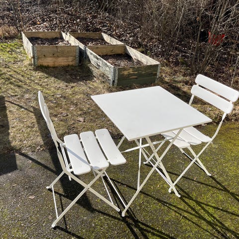Ikea utomhusmöbler, bord med 4 stycken Torparö positionsstolar.
