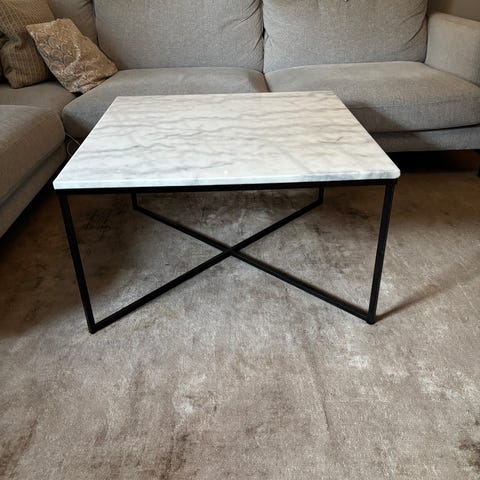 Vardagsrumsbord med svarta ben och vit/grå marmorskiva. Nypris ca 3500kr. Använt fint skick.