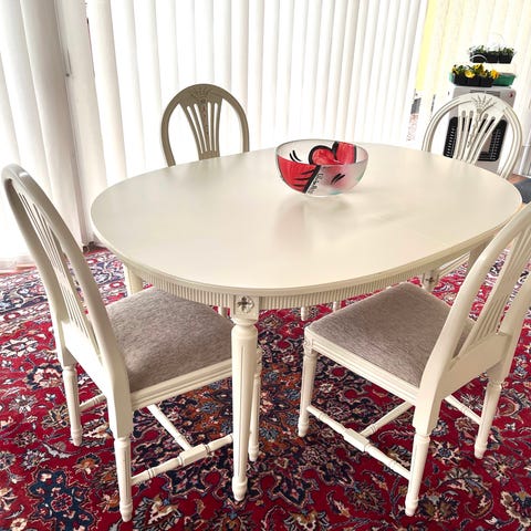 Matgrupp i gustaviansk stil, Axet. Bord med 4 stolar. Finns några märken men i övrigt i fint skick med stabila stolar.