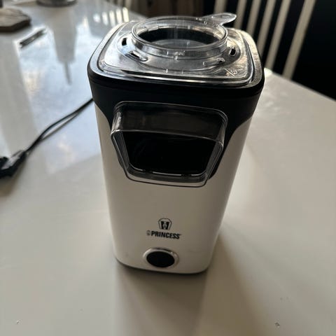 Champion popcornmaskin i bänkmodell i svart och vitt. Maskinen har en inbyggd metallgryta för poppning och genomskinliga sidor i plast som gör det enkelt att följa processen. Utrustad med handtag och lucka framtill för enkel tömning av popcorn samt strömbrytare ovanpå.