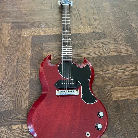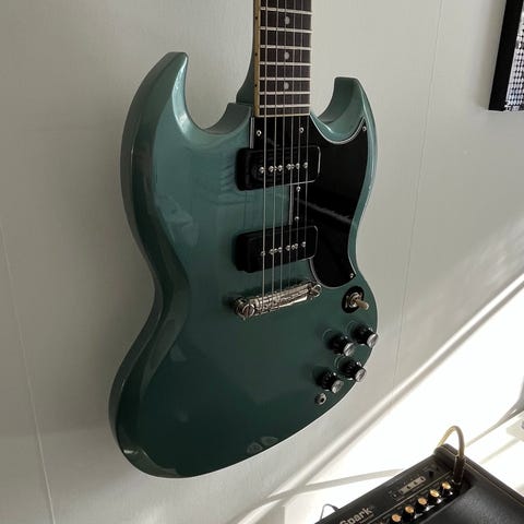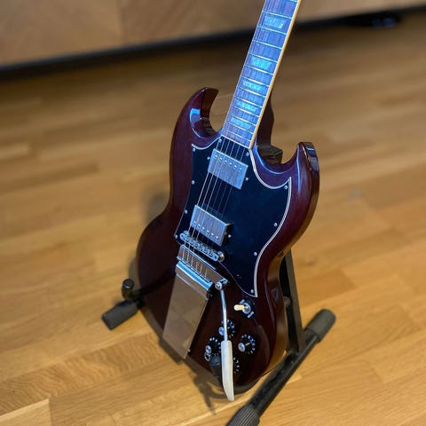 Gibson SG Melodymaker 1968 i orginal Pelham Blue lack. Mycket ovanlig då denna har fullstora huvudet och Stinger (svarta delen på huvudets baksida. Har endast hittat 2 andra med likadana specs på nätet.
