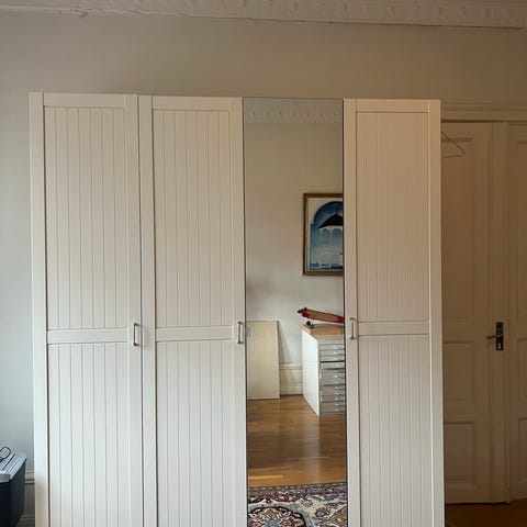 Tre dörrar med spegel i mitten. Spricka i ena bakpanelen, inget som påverkar funktionen.