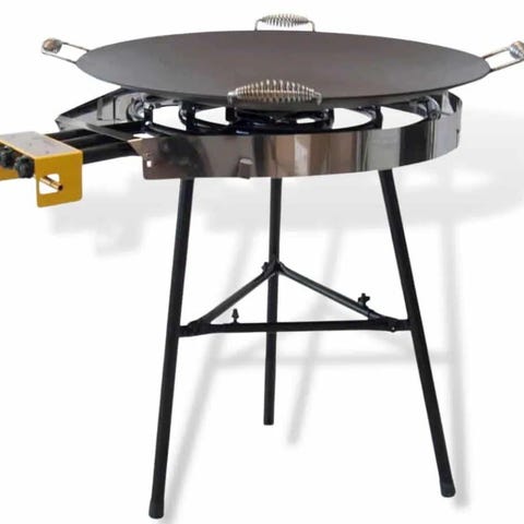 Muurikka stekhäll med gasolbrännare och tillbehör. Setet består av stekhäll, gasolbrännare med slang, löstagbara ben/stativ, sidobord/brickbord samt transport- och förvaringsväska med Muurikka-logotyp. Passar för matlagning utomhus i trädgård, på altan eller vid camping. Stekhällen är rund och används över gasolbrännaren för stekning och grillning av olika råvaror.