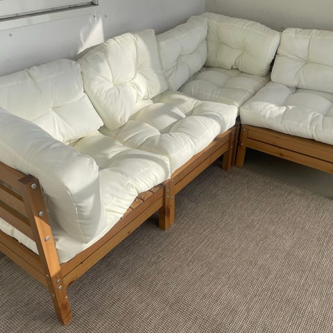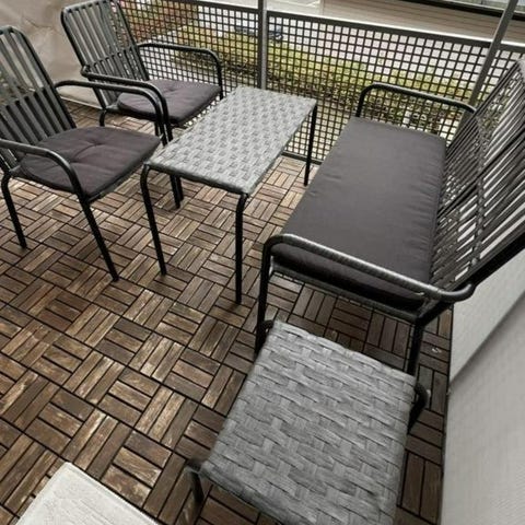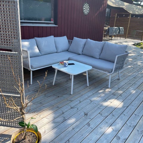 Utemöbelgrupp bestående av en soffa, två fåtöljer och två soffbord. Stomme i svart metall med flätade sidopartier och ljusa sitt- och ryggdynor. Soffborden har svart skiva och smala ben i metall. Passar för användning på altan, balkong eller uteplats som sittgrupp för flera personer.