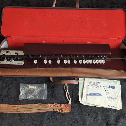 Ett ovanligt men vackert 6-strängat semi-akustiskt instrument i mycket bra skick som jag har ägt ett tag. Den kan ha två bassträngar (drones) och 4 strängar som, enligt japansk traditionell musik , ska normalt hålla samma ton. Bruksmässigt så kan det kännas som en blandning mellan gitarr och piano med knappar som påminner om en gammal skrivmaskin. Man skulle även kunna säga att det påminner om en nyckelharpa då du kan även använda en fiolstråke för att spela. Utrustad med en pickup, uttag för telekontakt (gitarrkabel), rattar för ton och volym. Jag lärde mig aldrig spela denna ordentligt utan brukade experimentera med rock, ambient och shoegaze musik (=mycket delay och reverb).