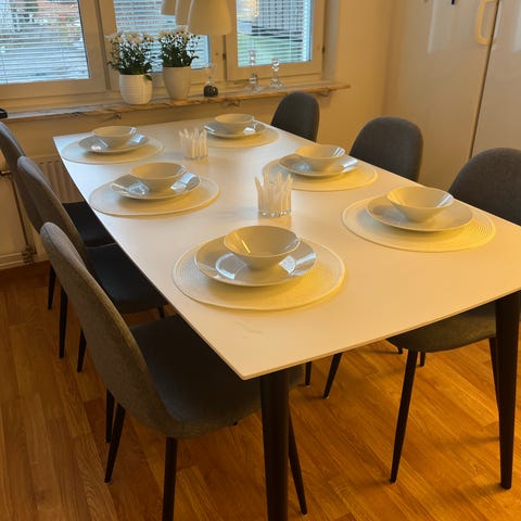 Säljer en vacker och rejäl matgrupp i massiv trä som ger en klassisk och tidlös känsla till matsalen. Gruppen består av ett stort matbord, 8 matchande stolar samt en iläggsskiva som gör att bordet enkelt kan förlängas när du får gäster.