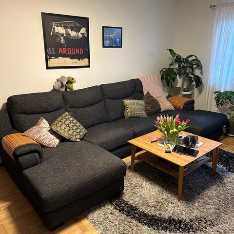 Hörnsoffa med divan säljes. Nytvättad mörkgrå klädsel.