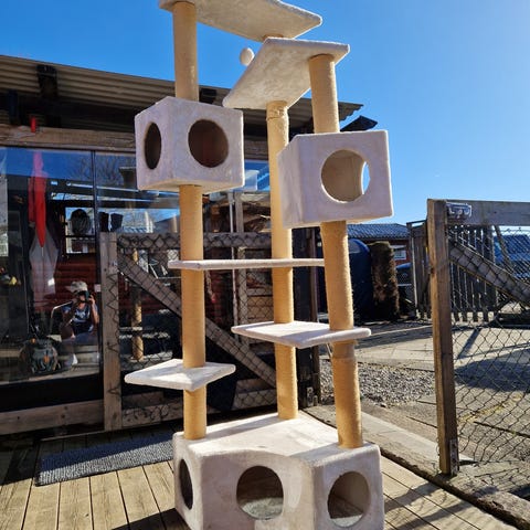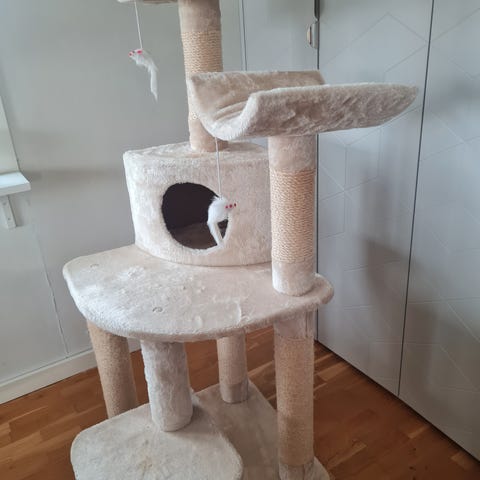 Katträd och klösmöbel med flera nivåer och sovplatser. Konstruktionen består av flera pelare med sisal för klösning, plattformar för vila samt rörformade krypin. Färgerna är främst gröna och mönstrade med bladmotiv samt ett separat grått kattrör med liggyta ovanpå. Passar för inomhusbruk till en eller flera katter som behöver klösa, klättra och vila.