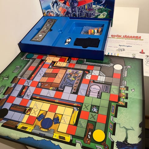 Arméspelet brädspel med spelplan, spelpjäser i form av kortbrickor och tryckta spelregler. Spelet innehåller en spelplan med rutnät och kartdel, samt färgade kort med text. Levereras i originalkartong märkt Arméspelet.